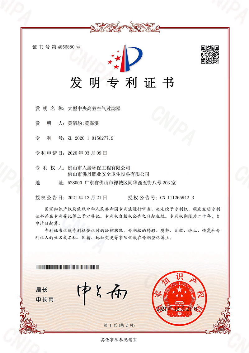 发明专利证书7:一种除尘系统的局部加压装置及工作方法(佛丹-2022)